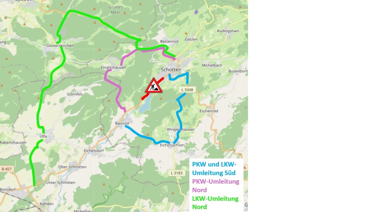 Für den Schwerlastverkehr ist in Fahrtrichtung Schotten eine weiträumige Umleitung über Ulfa und Gonterskirchen vorgesehen. Ähnlich der Maßnahme im letzten Jahr zwischen Eichelsdorf und Rainrod sind zudem wieder an mehreren Stellen LKW-Durchfahrtsverbote eingerichtet worden.