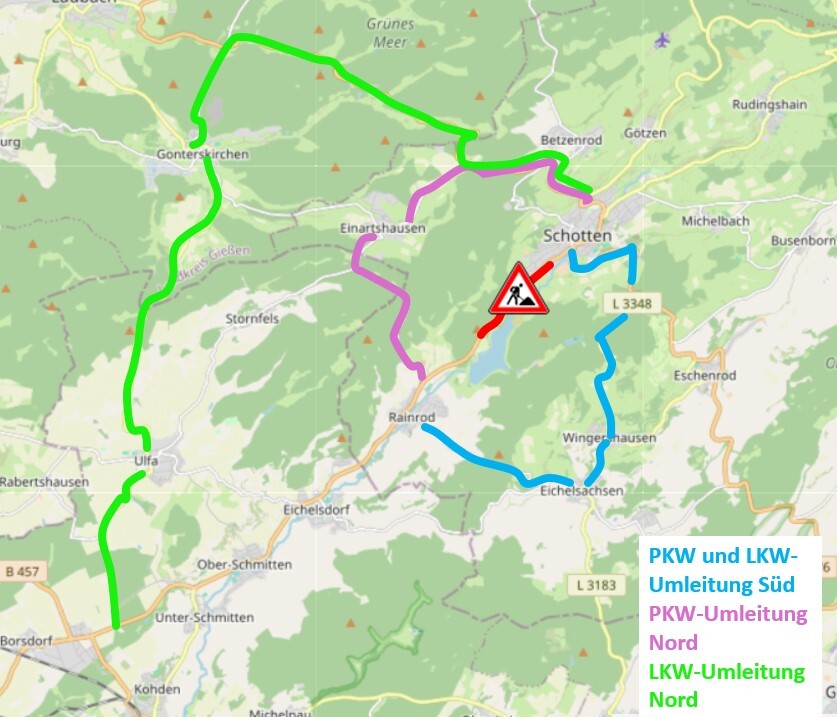 Verkehrsteilnehmende, die von Schotten nach Rainrod fahren wollen, werden über Wingershausen und Eichelsachsen ans Ziel geführt. In der anderen Richtung führt die Umleitung über Einartshausen nach Schotten.