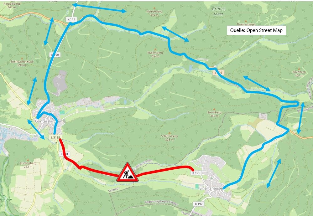 Der Verkehr wird während dieser Zeit von Gonterskirchen in Richtung Freienseen über die B 276 und den Abzweig nach Einartshausen umgeleitet – und in umgekehrter Richtung entsprechend.