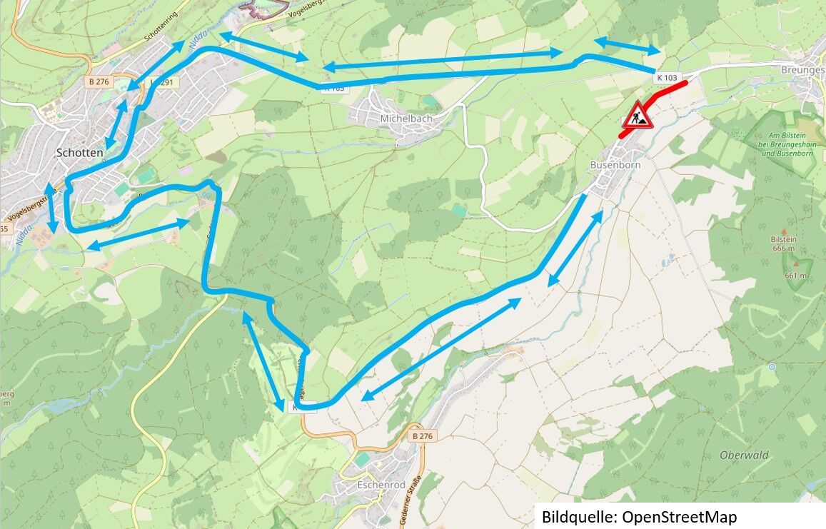Der Verkehr wird in dieser Zeit von Busenborn über die B 276, Schotten und die K 103 vorbei an Michelbach nach Breungeshain geleitet - und umgekehrt.