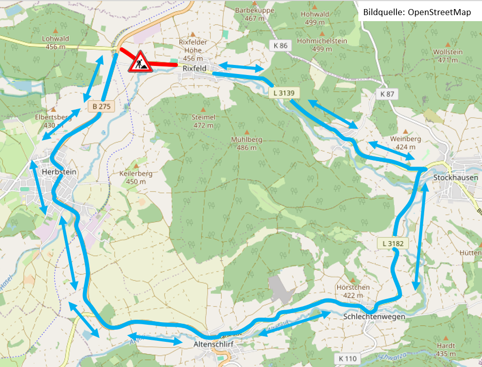 Der Verkehr wird in dieser Zeit über Herbstein, Altenschlirf, Schlechtenwegen, Schadges und umgekehrt umgeleitet.