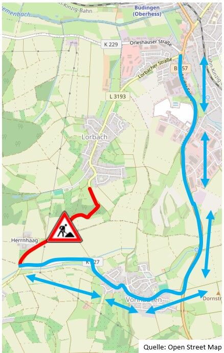Während der Bauzeit ist eine Umleitung eingerichtet: Sie führt von Büdingen über die B 457 nach Vonhausen und von dort über die K 227 zurück zur L 3193. Die Umleitung ist entsprechend ausgeschildert.