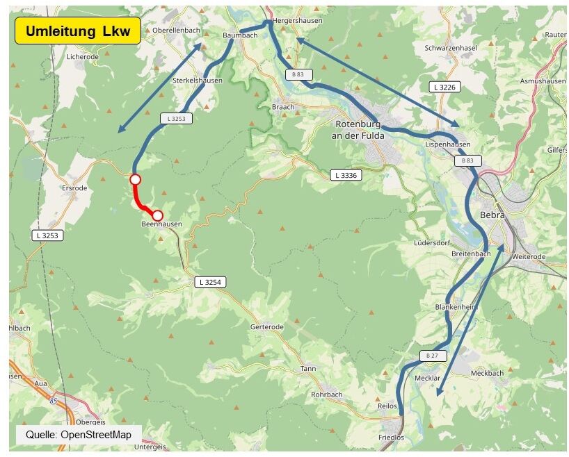 Die Umleitung für den Lkw-Verkehr führt von Ludwigsau über die B 27 nach Bebra, die B 83 über Rotenburg an der Fulda bis zum Abzweig nach Baumbach und weiter über die L 3253 nach Sterkelshausen und Ersrode - sowie umgekehrt.