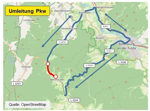 Die Vollsperrung muss zum Schutz der Arbeitenden vor Ort und der Verkehrsteilnehmenden bis zum Bauende bestehen bleiben. Der Pkw-Verkehr von Ersrode kommend wird weiterhin über die L 3253 nach Sterkelshausen und Baumbach, die B 83 nach Rotenburg a. d. F., die K 63 Richtung Wüstefeld und die L 3336 nach Beenhausen bzw. Niederthalhausen umgeleitet - ebenso in entgegengesetzter Richtung.