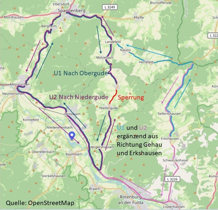 Die Umleitungsstrecke nach Obergude ist als „Obergude U1“ gekennzeichnet. Sie erfolgt ab Niedergude über Hergershausen via B 83 nach Heinebach, Morschen, Spangenberg und Landefeld nach Obergude. Von Erkshausen verläuft die U1 via Seifertshausen, Herlefeld und Landefeld nach Obergude.