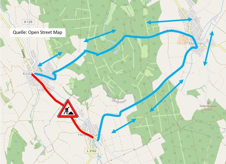 Der Verkehr wird während dieser Zeit von Helpershain und Köddingen kommend über Meiches umgeleitet.