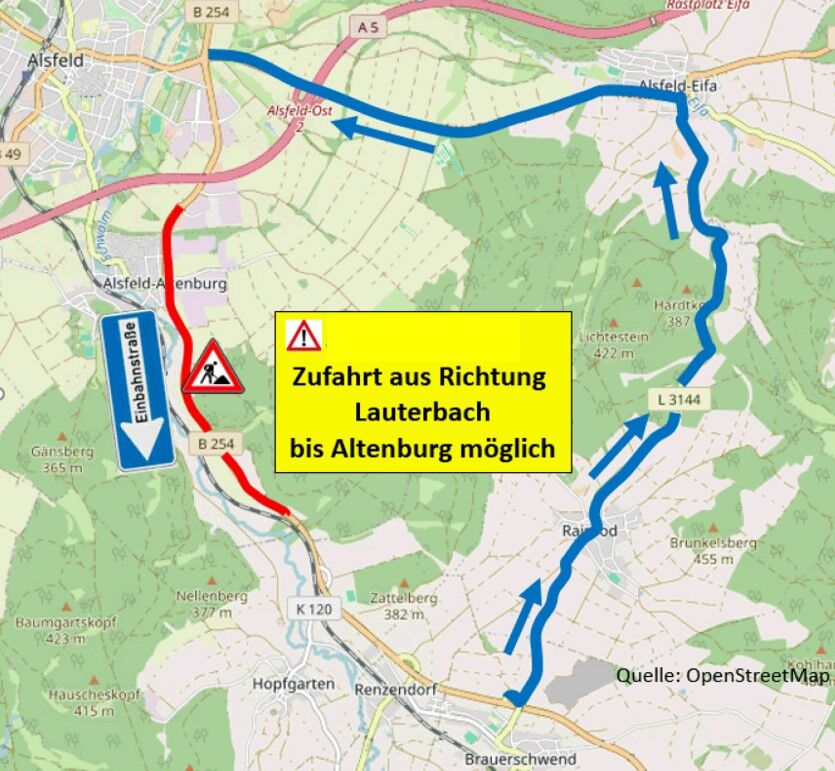 Aus Richtung Lauterbach bleibt der Streckenabschnitt auch weiterhin für den Durchgangsverkehr voll gesperrt und die Verkehrsteilnehmenden werden ab dem Abzweig bei Brauerschwend über Rainrod und Eifa in Richtung Alsfeld umgeleitet.